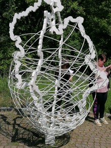 Das LWL-Schiffshebewerk beeindruckte mit antiken Museumgegenständen, z.B. einem Taucheranzug aus den 60er Jahren. Den passenden Helm haben sich auch einige unserer JägerInnen aufgesetzt und mussten feststellen, wie fortschrittlich vieles seitdem geworden ist. Für eine Informationstafel ging es eine Wendeltreppe hinauf, die jedoch nicht jeder erklimmen wollte. Nach tausenden von Stufen und mit schmerzenden Beine (man wollte schließlich nicht unsportlich mitten auf der Treppe ein Päuschen machen) kam man oben an und wurde mit einem schönen Ausblick auf die Schiffsschleuse belohnt. Der nächste Punkt war dann auch relativ zügig gefunden und wir stellten mit Freuden fest, dass es 300m zu Fuß zu erreichen war… jedoch… manch leichtester Weg ist häufig nur durch einen Umweg zu erreichen. So standen wir 3m vor dem zu suchenden TB, vor einem unüberwindbaren Hindernis, einem Zaun mit einer Tür, die jedoch abgeschlossen war. Also krakselten alle etwas bedröppelt zurück zu den Autos, um die 300m mit dem Auto zum TB zu fahren. Unter einer semimaroden Brücke wurden wir fündig. Kurz die Lösungsbuchstaben eingetragen und schon ging es in die Innenstadt von Lünen, die mit einer schönen Fußgängerzone aufwarten konnte. Nachdem die Rätsel dort gelöst und ein paar Fotos gemacht waren, genossen wir alle das obligatorische Samstagseis. Besonders in Erinnerung blieb die Persiluhr, die alte Werbung zeigte. Richtig Retro. Gesättigt ging es weiter zum geografischen Mittelpunkt NRWs, in Dortmund Aplerbeck. Ein Ort, über den sich nie jemand Gedanken gemacht hat…aber er ist da. Mitten im Grünen. Gekennzeichnet durch eine unförmige Weltkugel, genannt der „Kokon“. Ist das Kunst, oder kann das weg? Genauer betrachtet wurde der Umriss von NRW dargestellt. Nun haben wir im Laufe der Rallyes nicht nur den nördlichsten Punkt, sondern auch den Mittelpunkt NRWs in unsere Liste aufgenommen.